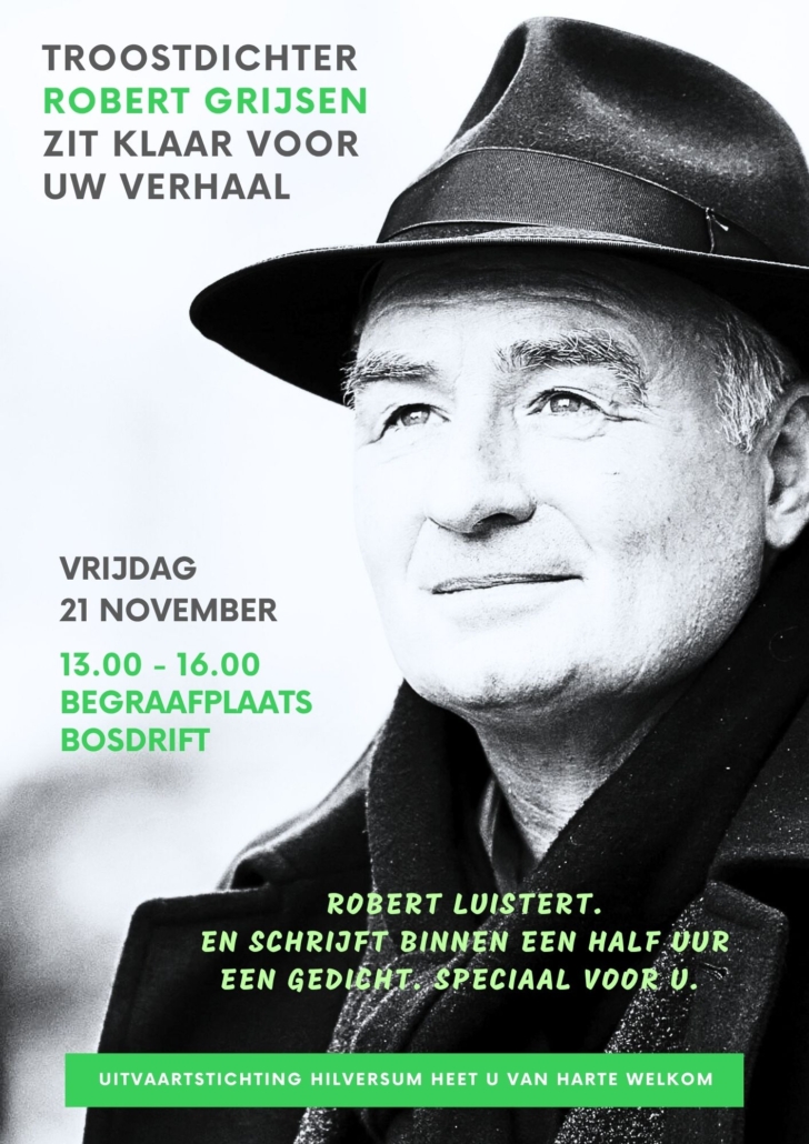 Woorden geven aan het onzegbare, dat doet troostdichter Robert Grijsen. Op vrijdag 21 November zal hij weer in de Huiskamer zitten, van 13.00 tot 16.00 uur. Je kunt naar hem toegaan met je meest persoonlijke verhaal. Of het nu gaat om verdriet, gemis, een gevoel van eenzaamheid, een probleem, een herinnering, je mag hem alles vertellen. Robert luistert aandachtig en schrijft er binnen een half uur een gedicht over. Met de hand, op mooi papier. Als het klaar is, leest hij het voor en kan het mee naar huis genomen worden. En dan heb je iets unieks in handen, om te koesteren, om in te lijsten. Robert Grijsen heeft ervaren dat zo’n troostgedicht echt van betekenis kan zijn. Hij kreeg al veel goede reacties: “In mijn hart geraakt”, zei iemand na afloop. “Ik ben je heel dankbaar voor dit allesomvattende gedicht,” liet een ander weten.